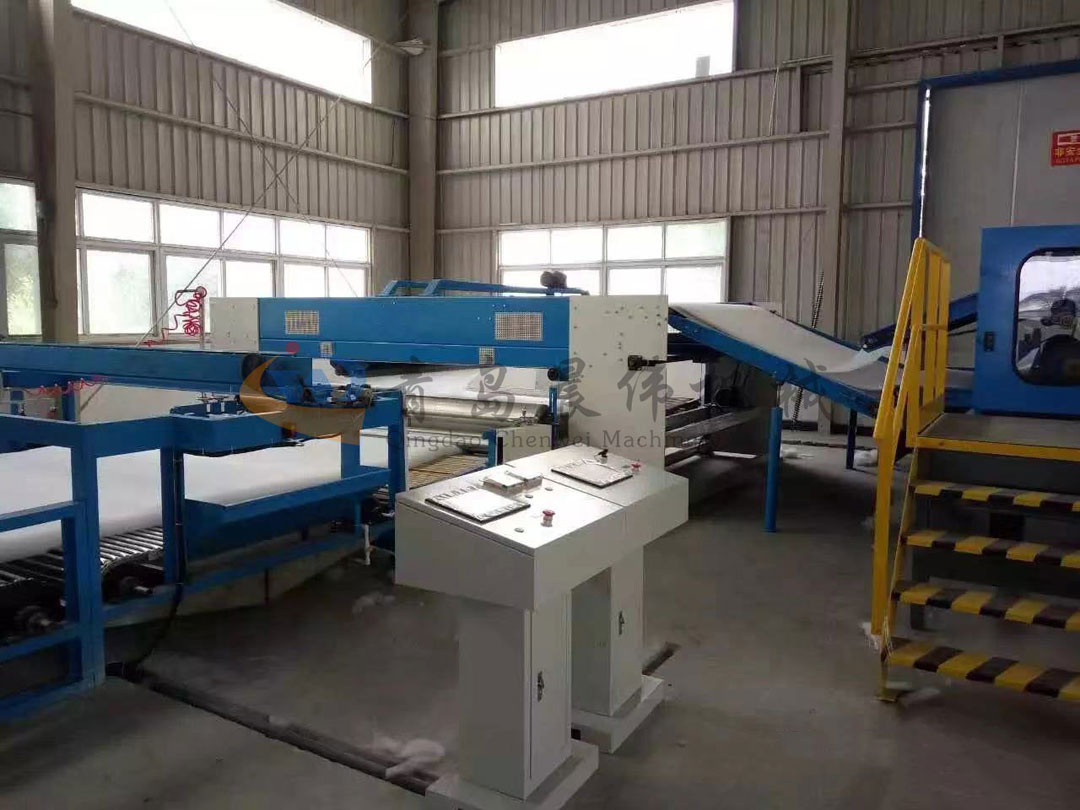 5. CWPW-鋪網機:用于將梳理纖網通過移動小車交叉折疊為所需幅寬和定量的多層纖網,以供后道工序使用。鋪網輥采用特殊結構,加裝壓網輥和導流板,不飄網不起皺,五只大功率電機精確控制各部件的運動,電動輸出簾高度調節(jié)裝置