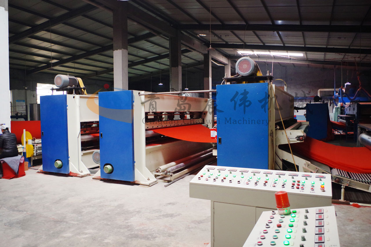 5. CWPW-鋪網(wǎng)機(jī):用于將梳理纖網(wǎng)通過移動(dòng)小車交叉折疊為所需幅寬和定量的多層纖網(wǎng),以供后道工序使用。鋪網(wǎng)輥采用特殊結(jié)構(gòu),加裝壓網(wǎng)輥和導(dǎo)流板,不飄網(wǎng)不起皺,五只大功率電機(jī)精確控制各部件的運(yùn)動(dòng),電動(dòng)輸出簾高度調(diào)節(jié)裝置