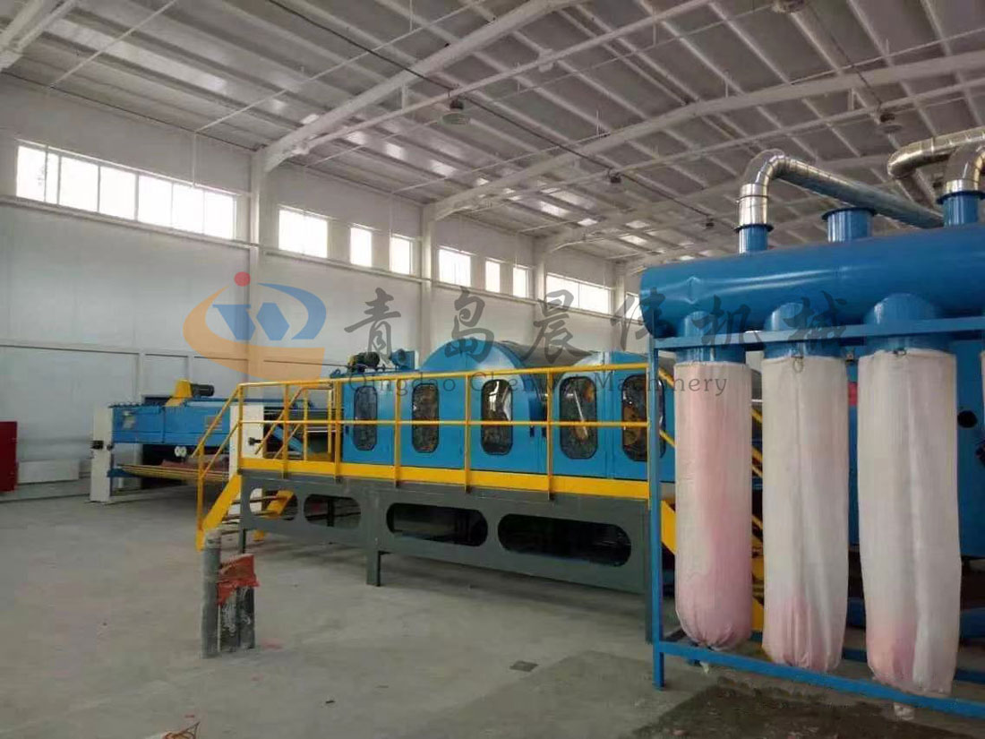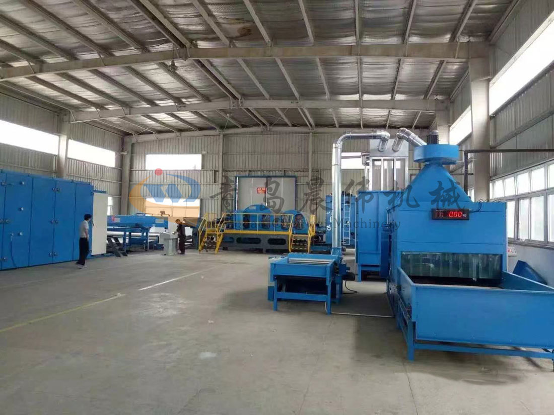 開包機(jī)-開松機(jī)-振動(dòng)給棉機(jī)-梳理機(jī)-鋪網(wǎng)機(jī)-烘房-成卷切片機(jī)