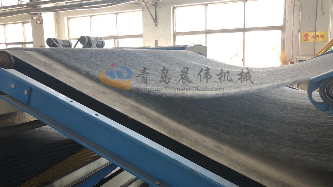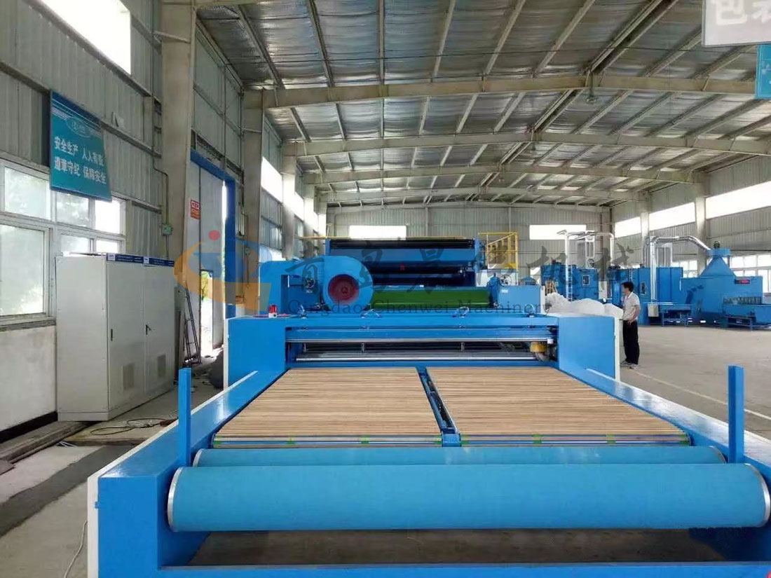 5. CWPW-鋪網(wǎng)機(jī):用于將梳理纖網(wǎng)通過移動(dòng)小車交叉折疊為所需幅寬和定量的多層纖網(wǎng),以供后道工序使用。鋪網(wǎng)輥采用特殊結(jié)構(gòu),加裝壓網(wǎng)輥和導(dǎo)流板,不飄網(wǎng)不起皺,五只大功率電機(jī)精確控制各部件的運(yùn)動(dòng),電動(dòng)輸出簾高度調(diào)節(jié)裝置