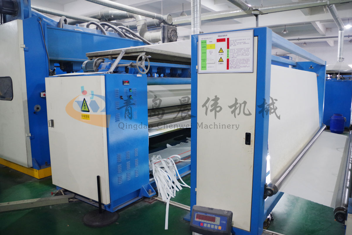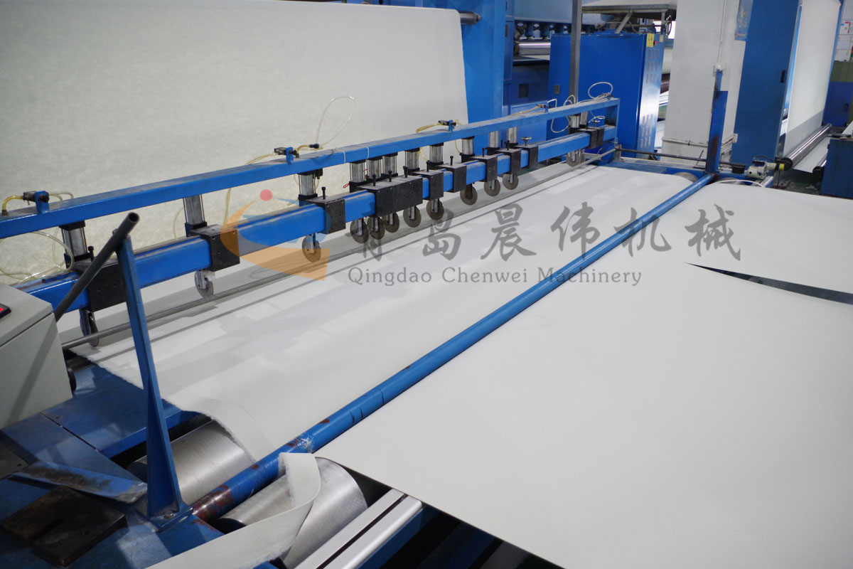 5. CWPW-鋪網(wǎng)機:用于將梳理纖網(wǎng)通過移動小車交叉折疊為所需幅寬和定量的多層纖網(wǎng),以供后道工序使用。鋪網(wǎng)輥采用特殊結(jié)構(gòu),加裝壓網(wǎng)輥和導(dǎo)流板,不飄網(wǎng)不起皺,五只大功率電機精確控制各部件的運動,電動輸出簾高度調(diào)節(jié)裝置