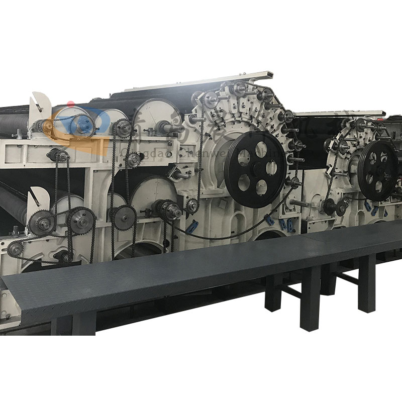 雙錫林梳理機主要是將前道工序棉網(wǎng)層進行單纖維狀態(tài)分散過程,并且等寬均勻的輸出到鋪網(wǎng)機,雙錫林梳理機適用于針刺。